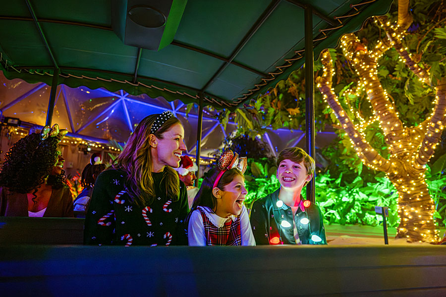 Before boarding your canopied tramp steamer, you’ll see that the skippers have also decorated the loading area with plenty of lights, sights and sounds for the holidays. Look out for some hidden details throughout your wait time — you never know what you’ll discover next about the shenanigans happening each day at the Jungle Navigation Company.