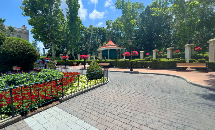 For example, in World Showcase, you’ll discover a treasure trove of ground level detail. Each pavilion features courtyards and walkways constructed in a distinctive style unique to the host country. Look for cobblestones in the United Kingdom, stone slabs in Japan, the colorful tiles in Morocco, and intricate brickwork in the American Adventure. Even at Disney’s Animal Kingdom, the walkways in the old Chester and Hester’s Dino-Rama mimicked the wear and tear of a well-worn parking lot, the perfect place for in impromptu carnival to set up shop!