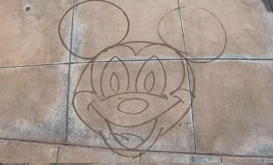 Speaking of Cast Member magic, keep your eyes open as you exit Epcot at night. You may catch a faint glimpse of a favorite Disney character in the walkway around Spaceship Earth. Even more surprising, you may notice that the illustration fades out as quickly as it appears! A moment’s study will reveal the source of these whimsical drawings; talented Cast Members armed with nothing more than a bucket of water and a special mop who wander around sketching Mickey and friends under the futuristic glow of the giant geodesic sphere.