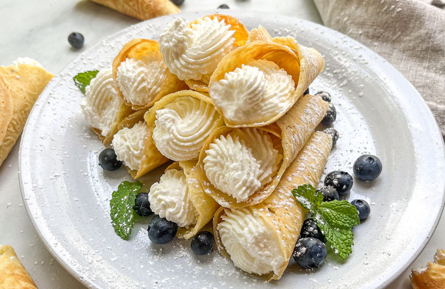 One of Anna’s favorite desserts is krumkake, a thin waffle-like cookie shaped like an ice cream cone stuffed with sweet fillings.