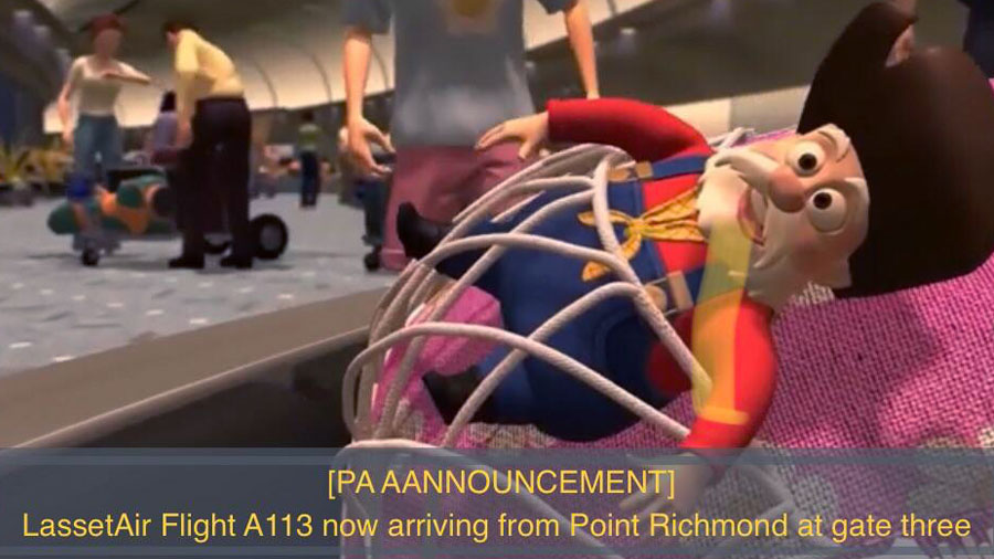 When the Barbie backpack containing Stinky Pete arrives on the conveyor belt, the announcer in the background announces the arrival of a flight named LassetAir Flight A113. LassetAir is a reference to director John Lasseter, and A113 is the Easter egg that has appeared in several Pixar films to date. However, in the DVD version, the subtitles misinterpret the part as Atlantic Air Flight 810.