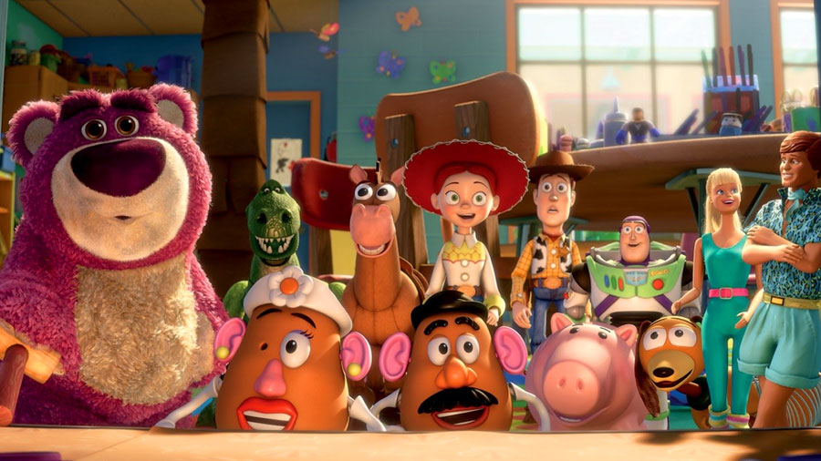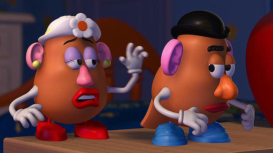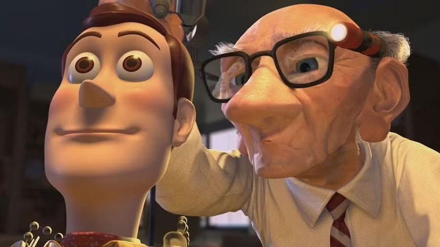 There are lots of Pixar self-references tucked away in the film. For example, the ball from Luxo, Jr. is shown in the Al’s Toy Barn TV commercial. It can also be seen when Buzz Lightyear and the toys enter the toy store, and a container of those balls can be spotted to the left of the door as they exit. As Hamm flips through the TV channels looking for the Al’s Toy Barn commercial, frames from several Pixar projects go by, including Tin Toy, Knick Knack, Red’s Dream, Luxo, Jr., Pixar’s Listerine commercial, and their old logo from the 1980s. Finally, the Cleaner who comes to fix Woody is Geri from the short film Geri’s Game. In one of his drawers, his chess pieces can be seen.